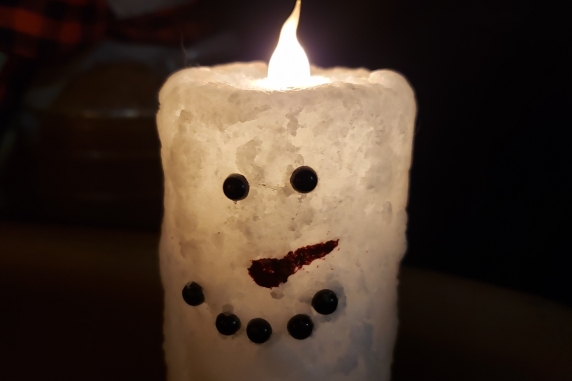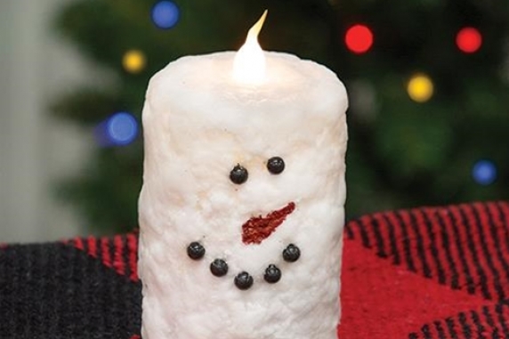 Snowman Votive Timer Pillar is a battery-operated pillar candle with a silicone-dipped bulb and a snowman design. Pillar is coated in textured, white wax, and it features a smiling snowman face made from black beads and a painted nose. A built-in timer feature allows the candle to stay lit for 6 hours, then off for 18 hours. Item requires 2 AA batteries (not included). Measures 3" high by 2" wide.